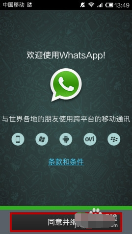 下载whatsapp软件,打开该软件进入欢迎页面(也可通过本站链接进行下载),whatsapp支持ios,安卓,黑莓,wp等智能手机,点击同意并继续。